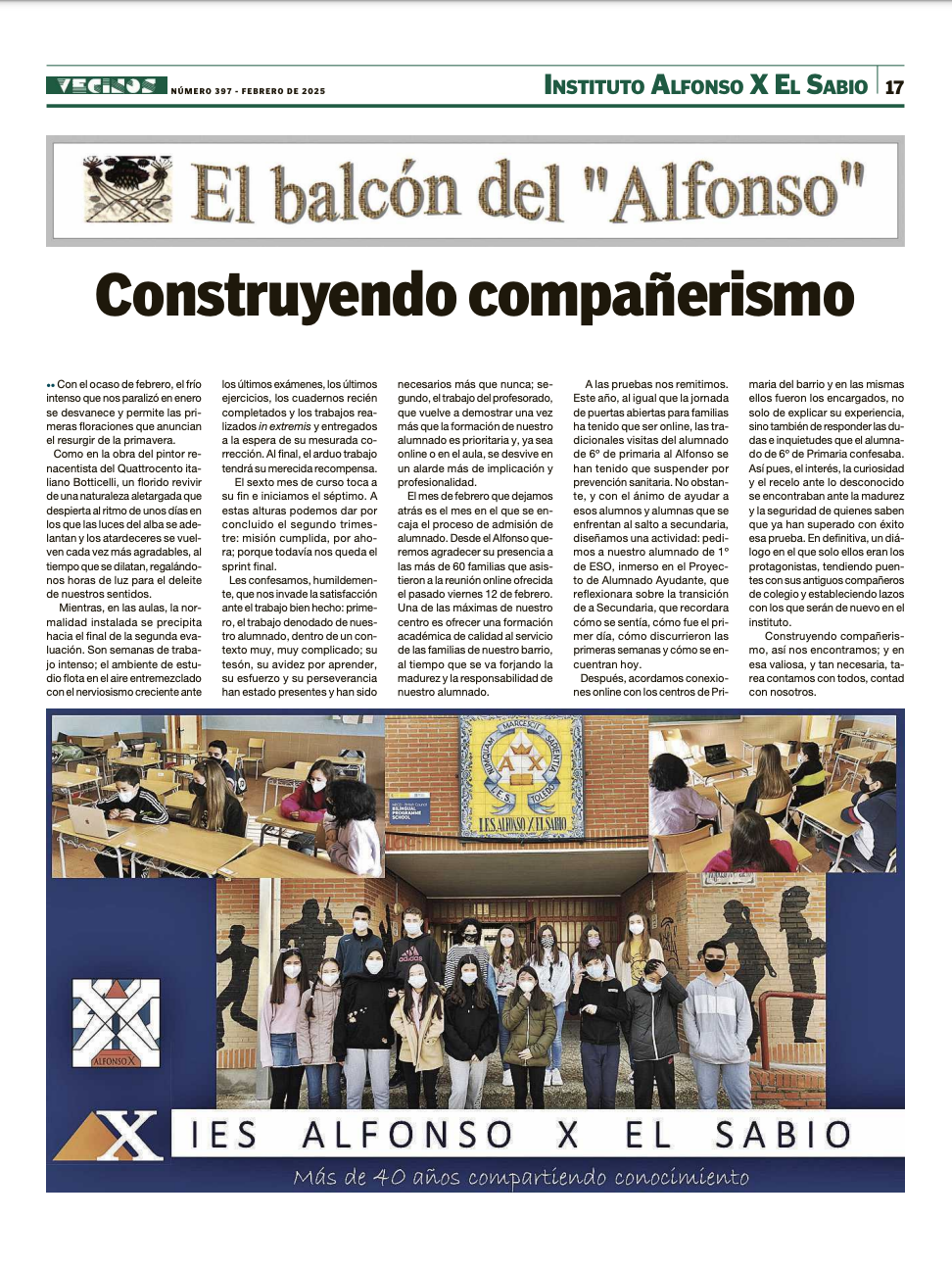 Nuestro instituto, IES ALFONSO X EL SABIO, colabora con el periódico de la Asociación de vecinos El Tajo del Polígono Residencial de Toledo: VECINOS.